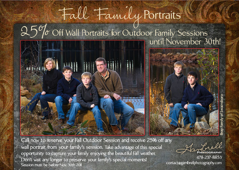 Call now to reserve your Fall Outdoor Session and receive 25% off any wall portrait from your family’s session.